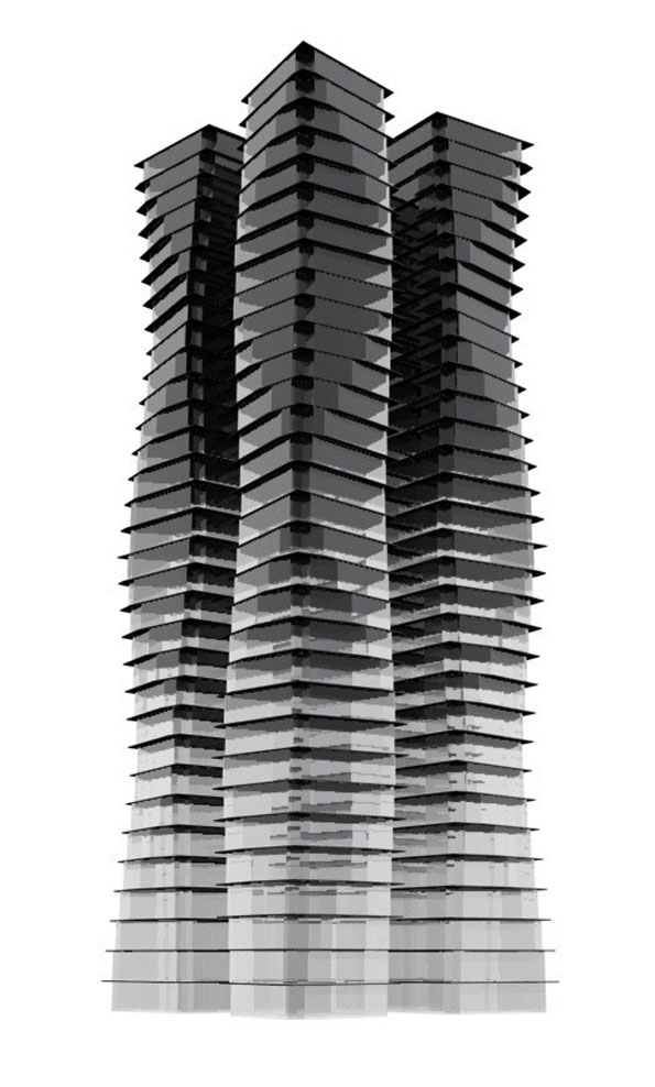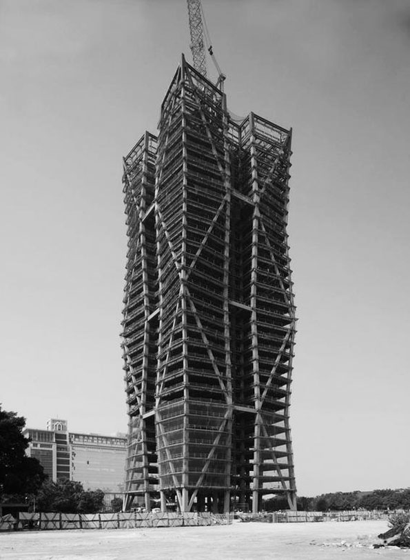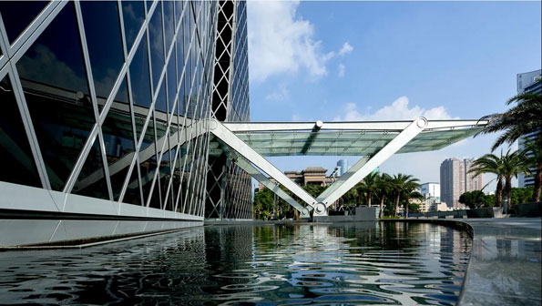 整栋建筑以四个方形量体中间夹著作为轴心的服务核所构成,量体以八层楼为一单位扭转 12.5 度,形成动态的几何形体。大元联合建筑师事务所仿照商周时期青铜礼器中最为尊贵的四足方鼎作为设计意象,鼎居古代礼器之首,亦为商周时期权利和地位的象征,代表稳重厚实、吉祥亨通、和谐意向,引申为坚忍不拔、百折不挠钢铁韧体的意象,集合四个多面方形量体,优化抗震能力外,充分表达钢力美学态度。