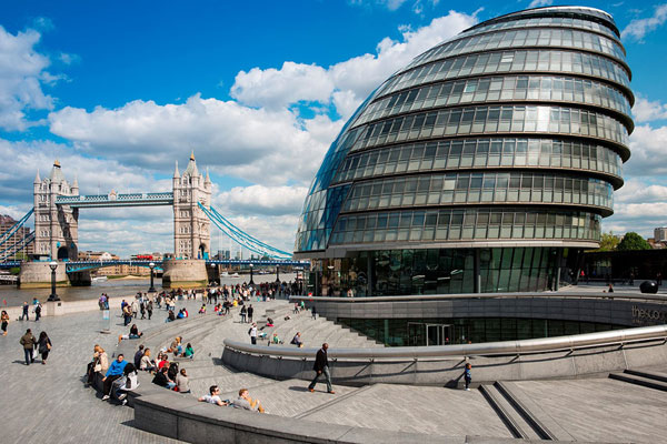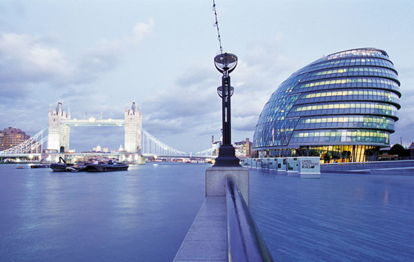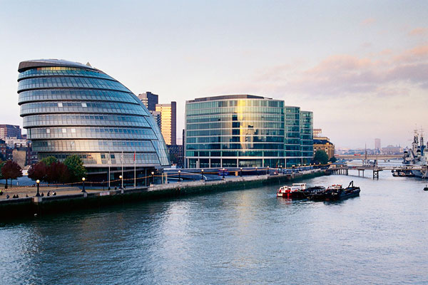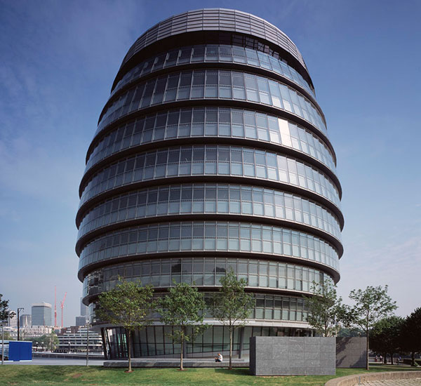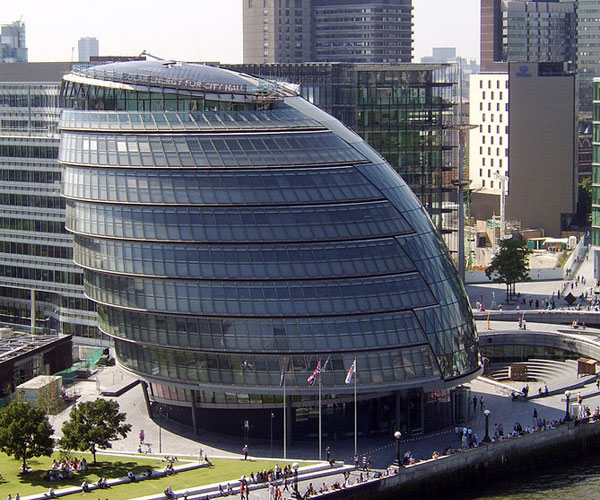 福斯特设计的英国伦敦市政厅——一座倾斜螺旋状的圆形玻璃建筑,就立于泰晤士河南岸,与古老的伦敦塔隔河相望,成为了泰晤士河畔的标志性建筑之一。新颖的设计使该建筑的象征意义不言而喻:透明办公,民主政府。在广场游览的公众可以直接看到市政厅大楼里的每一个细节。