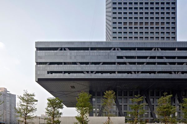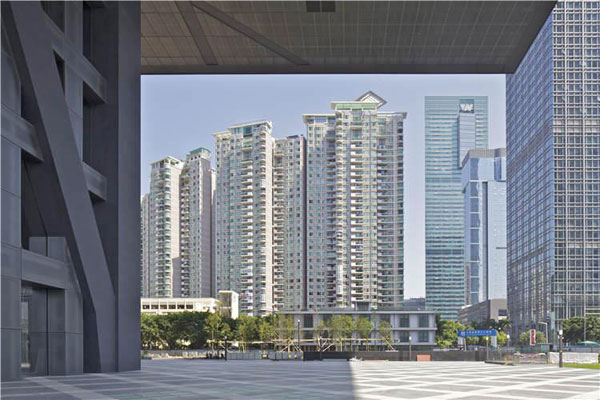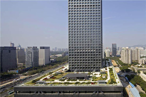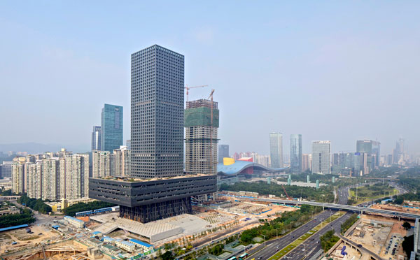 楼高46层 (254m) 的深圳证券交易所是一栋富人民意义的金融中心。这座建筑物地处一个新的公共广场上,在莲花山及滨河大道之间的南北轴线、以及东西轴线兼主干线深南大道的交 汇之处。深交所并不是城市中一个孤立的建筑,它是真正能够在多尺度、多层面与城市相契合的建筑。有时它显得巨型宏伟,有时它平易近人而个人化。深交所时刻 都与城市肌理建立新的关系,它渴望成为推动新型建筑和都市的原动力。