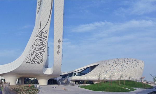 卡塔尔多哈伊斯兰研究所Qatar Faculty of Islamic Studies),卡塔尔伊斯兰研究所是一所教育学校,也是一所伊斯兰教堂,建筑周身刻有《古兰经》中的伊斯兰书法和诗歌。
