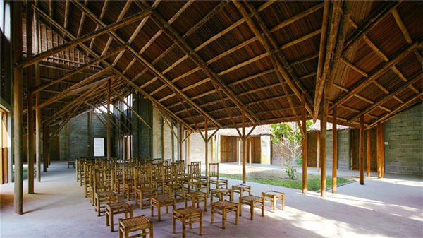 越南惠安社区活动中心(Cam Thanh Community House)。整个设计简单质朴,并且充分利用了当地的资源和材料。由竹子与椰子树叶铺成的房顶一起极大地削弱了太阳光辐射的威力,同时还为室内提供了阴凉。