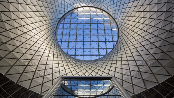 美国富尔顿转运中心(Fulton Center)。位于纽约市中心的富尔顿转运中心连接11条地铁线路并每日运送30000名乘客,中心建有大型天井,阳光透过玻璃穹顶可直射入建筑内。
