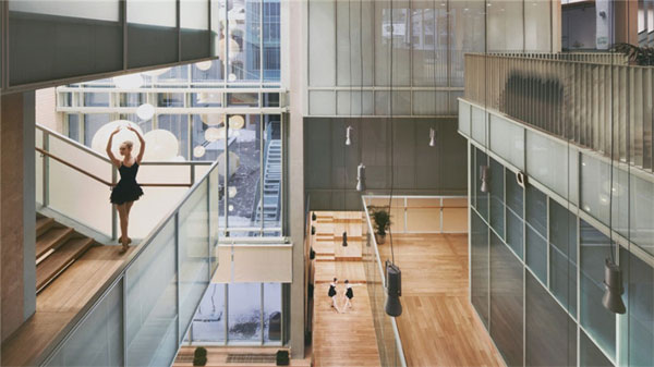 俄罗斯圣彼得堡芭蕾学校。该建筑建造于电影院与邻近住宅之间,用半透明的玻璃分隔开来,以保证自然光可以最大程度的照射进来。