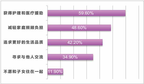 获得及时的护理和医疗援助是老人入住养老设施的首要动机。随着子女异地就学、异地工作现象的普遍化,城市和农村的空巢老人越来越多。许多空巢老人随着年龄的增长,感到独立生活较为吃力或生活部分不能自理时,会产生入住养老设施的想法,以便能获得及时的护理,并在突发疾病时得到医疗援助。另外,在与子女分开居住的老年夫妇中,一方去世、另一方失去生活上的照应时,也会促使老人产生“老伴儿不在了,一个人没意思,不如去养老公寓”的想法。
