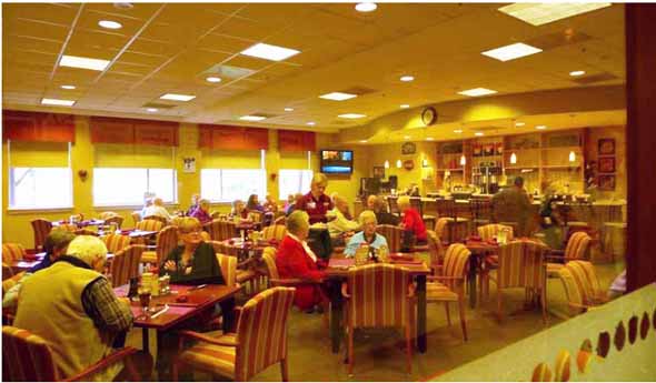 图4 美国某养老公寓餐厅:气氛与一般商业餐厅相似,给老人一种活泼的社会氛围(作者自摄)