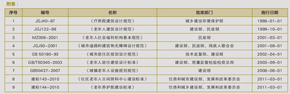 一是借鉴境外开发建设老年住区的标准、规范和经验,协助政府和行业主管部门提出与实施建设老年住区的标准。自1987年至2011年,住建部、民政部、国家质量监督检验检疫总局、国家发展和改革委员会等相关部委已发布了九本与老年住区的规划设计、建筑设计、养老服务、机构管理、设施设备等方面的设计规范、管理规范或建设标准(详见下附表)。