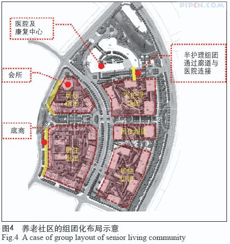 我国由于老年人口总数大,一定量的大型养老社区必然会出现,此时可以通过组团化的布局方式将居住规模控制在一定范围内,以增强居住环境的亲切感(图4)。《城市居住区规划设计规范》中指出普通的居住组团规模在1000到3000人左右,笔者建议养老社区的组团规模应更小一些,并宜采用多层的住宅形式,例如健康老人的居住组团可以在500到1000人,需护理老人的居住组团为150到300人左右。一方面老人的行动能力有限,过大的居住组团不利于其外出活动,也不便于社区提供服务;另一方面,人到老年后记忆力和认知能力有所衰退,对于居住环境和周围人群的辨识力下降,并不能够记住太多的邻居,紧密相处。因此养老社区的组团规模应当较小,以便使老人能够更好地熟悉周围的居住者,获得对社区的归属感。