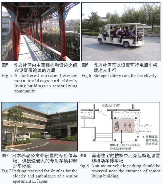 社区内的主要车行道应串联各个组团,步行道路应尽可能呈环形接通。社区内各楼栋和设施之间最好能设置带遮蔽的连廊(图5),以便雨雪天气时老人仍可安全出行。目前一些养老社区的规模较大,老人从居住组团到公共服务设施的距离过远,不利于老人的生活,不得不这样时应提供社区电瓶车等搭载老人出行(图6)。