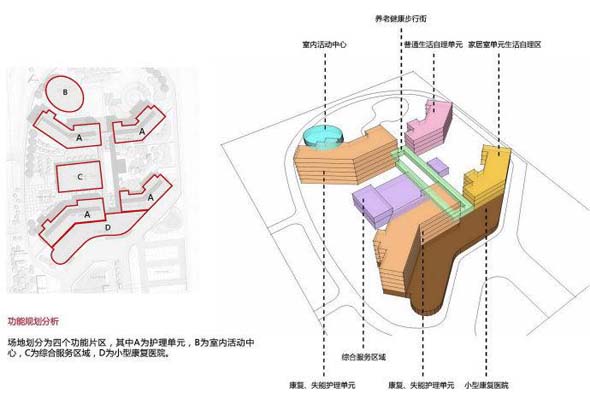 对于上述三个层级的医疗保健设施的组团形式,可以独立分区设置,老人通过治疗评估,可以更换入住不同的医疗健康机构,也可通过鱼骨式体系将其集中布局,但单元可以相对独立,形成内外空间的渗透。总得说来,在老年社区医疗及保障设施体系中我们应充分考虑老人各年龄阶段对医疗需求的复杂性,对其健康状况划分人群为基础,结合老年病种,就医及护理状况,合理布局从而给出持续医护的解决方案。