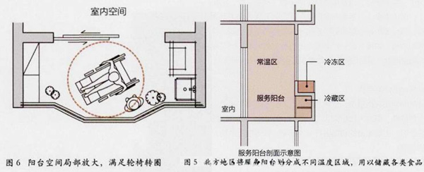 因此在设计时,如能将服务阳台划分成不同的温度区,如常温区、冷藏区、冷冻区, 迎台老人利用自然条件进行储藏的需求,便于老人分类和拿取,也能起到充分利用空间和节能的作用(图5)。