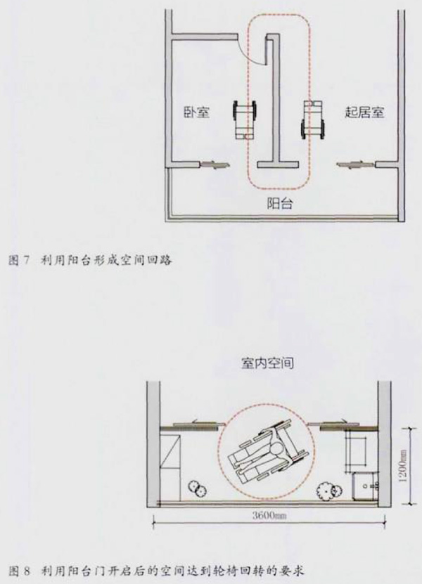 利用住宅内其他房间与阳台形成空间回路也可以间接解决阳台进深狭窄的问题。生活阳台通常与卧室、起居室等房间相连通。如条件允许,建议用阳台连接两个房间,使卧室一阳台一起居室形成空间回路,解决轮椅回转空间不够或轮椅和人交错行走相互干扰的问题(图7)。利用阳台门的开启空间完成轮椅转圈也是简单可行的办法(图8)。