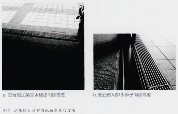 阳台还需注意潲雨问题。封闭式阳台应做好阳台窗的防渗水措施。开敞式阳台应防止下雨时雨水倒流至房间内,须注意做好阳台的坡及排水措施。阳台与室内地面的交界处可设置排水算子, 既能防止暴雨、台风来临时雨水流八室内导致地板浸水变形,也有利于阳台与室内地面找平(上图9b)。
