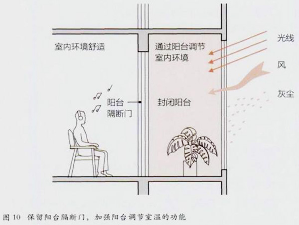 阳台与相邻空间之间应设置密闭性能优良的玻璃隔断门,以便调节阳台过冷或过热的空气。以往一些住宅在装修肘,常会为了扩大室内空间而将阳台玻璃门拆除。但在老年住宅中,建议保留此隔断门, 既能加强调节室温的功能,又能防灰尘、防潲雨、调节通风量(图10)。