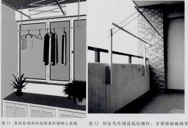 老人的被褥应该经常晾晒,消毒杀菌。考虑到被褥和床单体量大且重,可在阳台中部高度设置结实的专门晾晒被褥的横杆,方便老人自行操作(图12)。