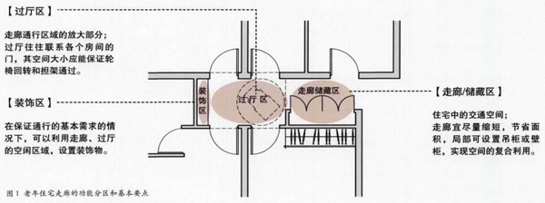 走廊作为连接各个功能房间的过渡空间十分重要且不可或缺。在老年住宅中,走廊也是无障碍通行设计的重点。走廊的功能不只是单一的通行功能,可以通过台理的设计,使走廊空间的利用率更高,使用更便利(图1)。