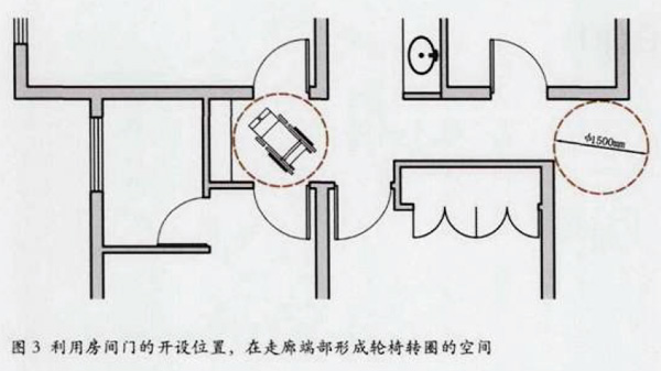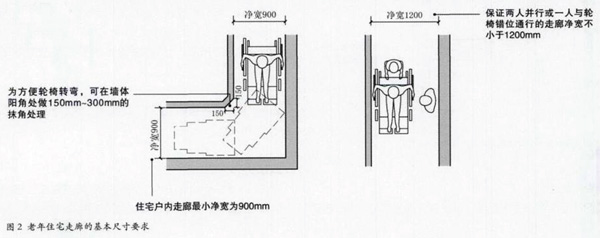 在老年住宅设计中 走廊不宜狭窄和曲折,否则易造成轮椅和担架通行不便。通常户内走廊的净宽宜为900mm ~1200mm(图2)但为了方便轮椅回转和节约面积,可将走廊做一些宽度变化。例如在房门集中处将走廊局部扩大,方便轮椅转圈选择方向而不必将走廊宽度整体加大(图3)