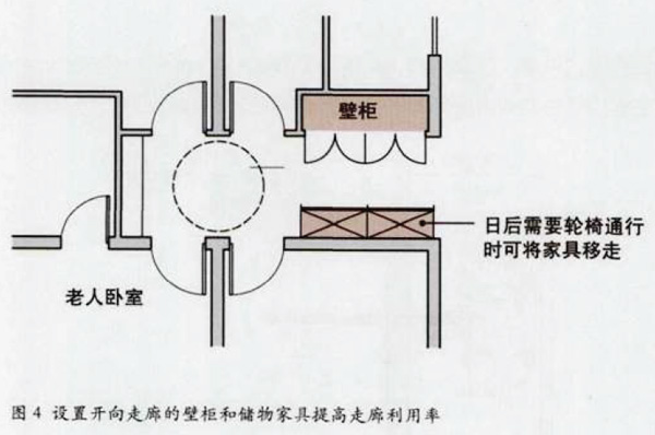 有条件时,可设置较为宽裕的走廊,当老人身体健康可自立行走时,可在走廊两侧墙面安排易于拆除或可移动的储物壁柜、家具,使走廊的一部分成为储物功能(图4):当老人需要坐轮椅时,可拆除壁柜或移走家具,便于轮椅通过。