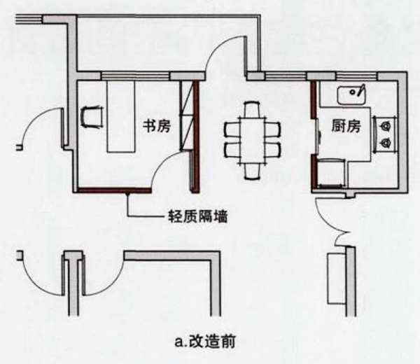 走廊两侧的墙面不宜部为承重墙,最好有一面为隔墙,易于改造。在必要时,也可将走廊空间开敞化.纳入其他房间,扩大使用面积实现空同的复台利用(图5)。