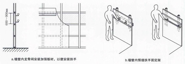 较长的走廊中应设置扶手,尤其是老人夜间去卫生间需经过走廊应在必要处设置扶手 或预埋扶手固定件,以便在需要时安装(图6)
