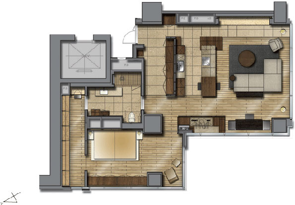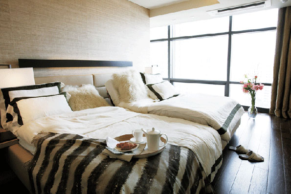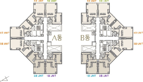 A、B两栋楼老年公寓每层均有相同面积的6户,分两种户型,户型均为184平方米(专用面积约125平方米),奢侈型大一居,每个房间面积很大,且有大量的储藏空间,避免给客户临时居住的印象,强调家庭居住功能。