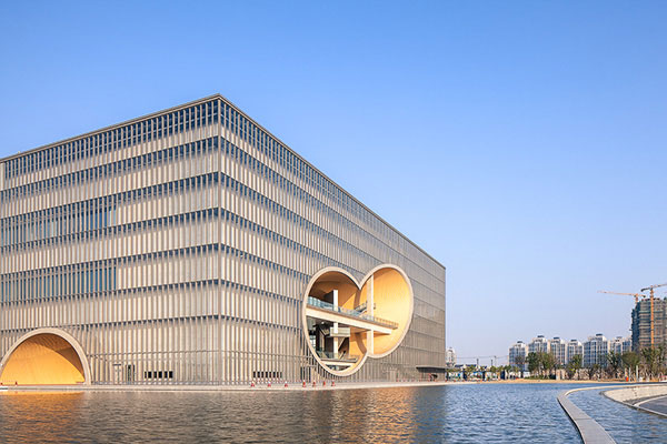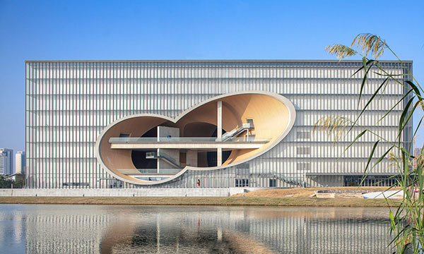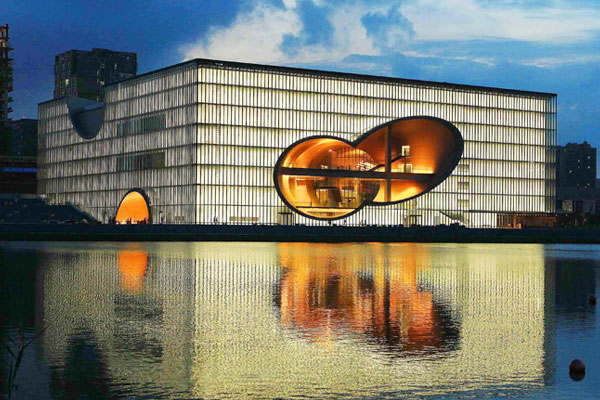 随处可见各种几何图形:观众入口大厅的圆形天顶,镶嵌了一块正方形“人造繁星板”;整个主建筑采用“圆筒”这一建筑中并不多见的形式,一个个看似简单的圆筒,却有着奇妙变化和联系。它们有勾连、有交错,构成入口大厅、观众休息厅、半室外剧院、屋顶舞台等多样性的功能空间……除了几何图形,深谙建筑与水、风、光等元素结合的安藤忠雄,将自然景观纳入大剧院的整体建筑中。以贵宾区域一角为例,落地窗外即是一片开阔清亮的湖景;而在内里,安藤特别设计了一处正方形内庭,清水池、四边混凝土、自然天光,构成自然、建筑、艺术、人文等彼此和谐相容、自在对话的艺术交流空间。
