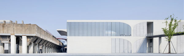 龙美术馆西岸馆位于上海市徐汇区的黄浦江滨,基地以前是运煤的码头,设计开始时,现场有一列被保留的上世纪50年代所建的大约长110米、宽10米、高8米的煤料斗卸载桥和两年前已施工完成的两层地下停车库。