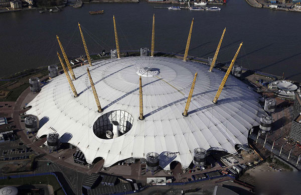 最后建成的穹顶周长为1km,直径365 m,中心高度为50m,它由超过70km的钢索悬吊在12根100m高的钢桅杆上。屋顶由带PTEE涂层的玻纤材料制成。在穹顶的中心是一个灵活的、极富戏剧性空间效果的中心舞台。 理查德·罗杰斯(Richard Rogers)预想中仅需4500万英镑的设计最后却花费超过10亿英镑。