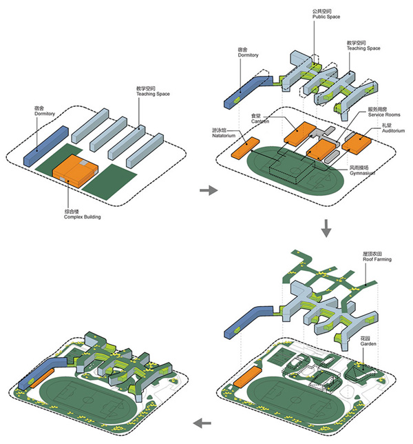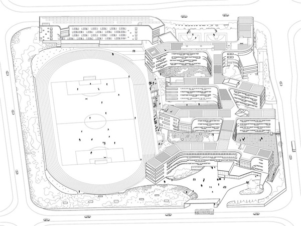 两种类型的教育空间之间的张力,及其各自包含的丰富的功能,造就了令人惊讶的空间的复杂性。为每类不同的功能所做的适合其个性的空间,使得这个功能繁杂的校园建筑具备了城市性的体验。与一个典型的校园通常具有的分等级的空间组织和用轴线来约束大致对称的运动所不同,这个新学校的空间形式是自由的、多中心的,可以根据使用者的需求从任意可能的序列中进入。空间的自由通透鼓励积极的探索并期待不同个体从使用上的再创造。希望学校的物理环境能启发并影响当前中国教育中一些亟需的变化。