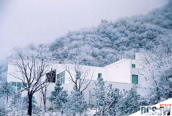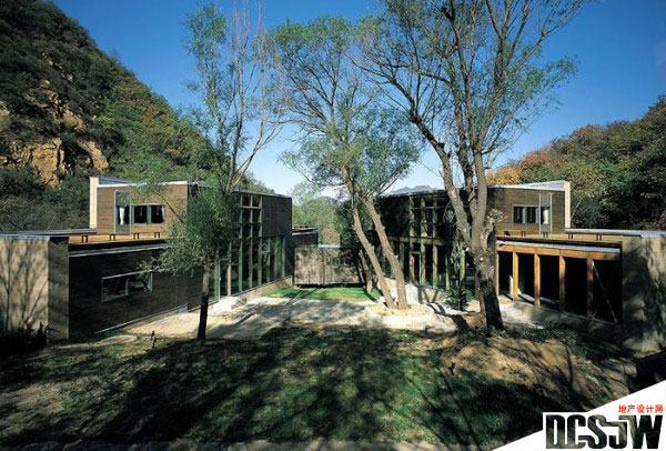 土宅位于12个别墅的制高点,依山就势,形成半自然半人工的庭院围合,墙体为中国西部常见的夯土墙,冬暖夏凉。一条小溪从大厅玻璃地板下潺潺流过,室内一派山水的意境。