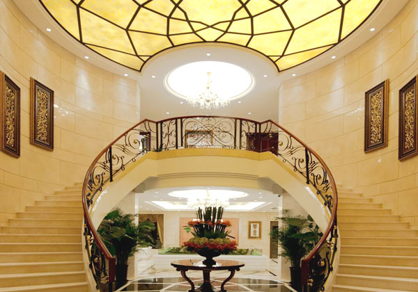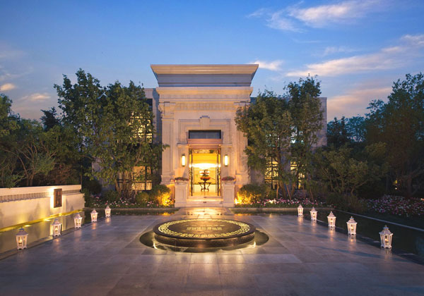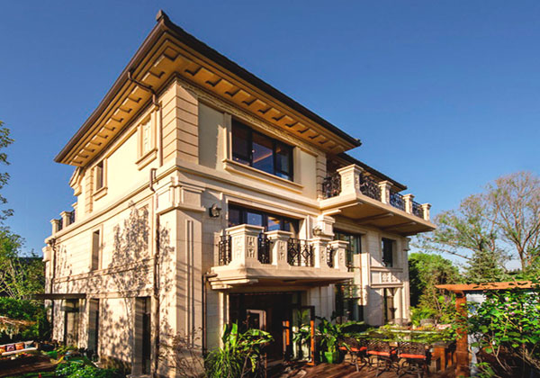 主入口“迎水照壁”彰显礼仪,景观大道“组团照壁”空间隐秘转折,私宅前“门庭照壁”专属图纹定制,三进照壁,三重门第礼序,依传统北方园林造园中的“障景”之术循序而立。在整体建筑采用西方石材建构的同时,巧妙地将中国庙宇的窗棱、斗拱、屋檐的建筑手法进行融合,将中魂西技的技艺演绎得淋漓尽致。