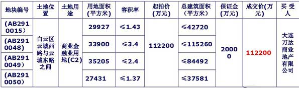 2009年10月29日大连万达商业地产有限公司以11.22亿元的底价拿下广州市白云新城四宗商业金融地块,折合楼面地价4006元/平方米国土部门为该地块的土地出让设置了较高的限制,要求竞买者2007、2008年总资产均达120亿以上(含120亿)、银行授信额度100亿以上、 并具有在国内大中城市成功开发累计总建筑面积不少于200万平方米 大型商业中心、五星级酒店项目的经验,并规定竞得人要确保地块上 大型商业中心于2010年10月底前开业。
