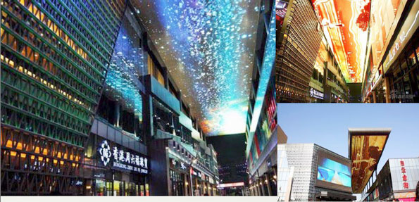 其次,广场外墙设置了两块面积均超过60平方米的巨型LED屏幕,营造出独特的商业氛围;