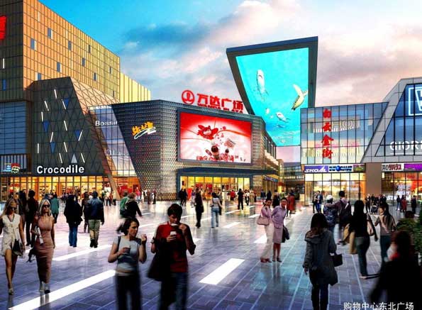 4、 增加近人尺度的空间丰富性。万达广场功能复杂,体量巨大,与城市之间的界面往往进行了简化处理。这在保持了整体感和大气感的同时,也带来了与城市和人接触的界面的单调感。因此,广州白云万达广场的设计中一方面致力于延续万达的优秀建筑传统,一方面也考虑在近人尺度上改变原有的比较冷漠与单调的界面,增加材料质感与种类,色彩变化较为丰富,使城市人群在万达广场内的空间体验得到改善。