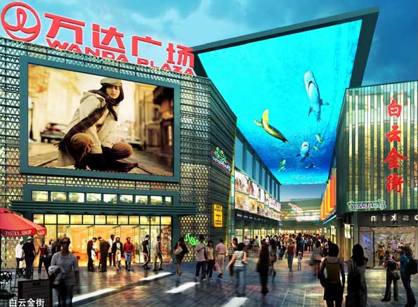 在白云万达广场的立面设计保留并强化了以下具有万达特色的建筑立面特征: