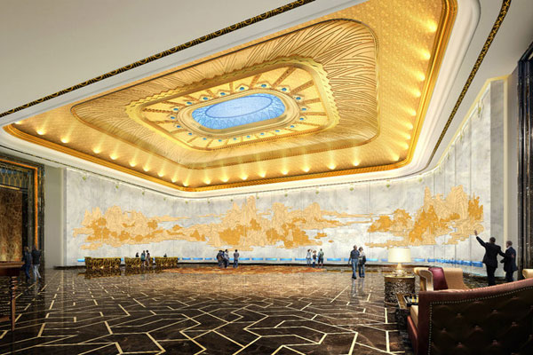 酒店整体空间和材质的运用上都无所不用其极酒店大堂、公共空间及房间内部的主材全部选用房山汉白玉、岫岩玉、阿富汗玉、金丝白玉、意大利黑金花 等名贵石材,房间内部洗浴五金全部上镀24k金,极尽奢华,酒店建成后的豪华精美程度将会让人感到超出自己以往关于奢侈的全部想象;