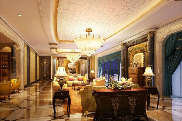主材:玉石、皇家金、黑金花、金丝白玉、金箔、艺术壁纸、水晶。