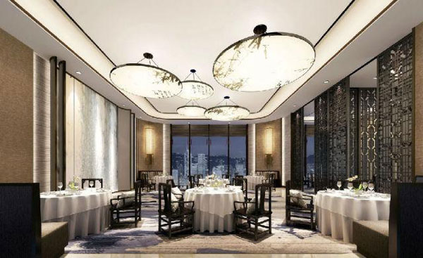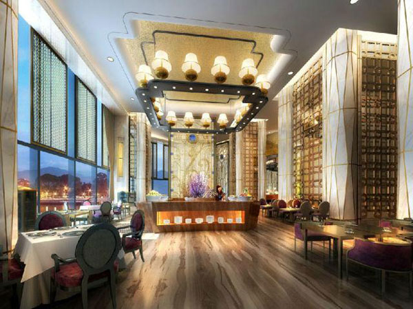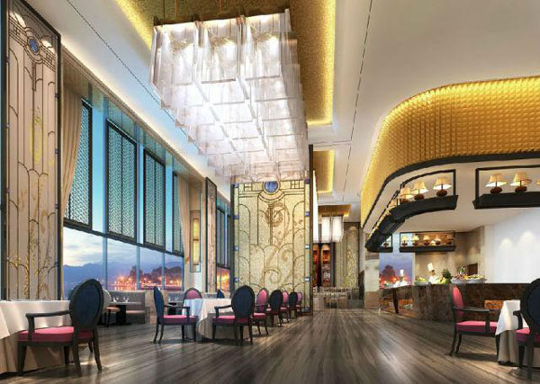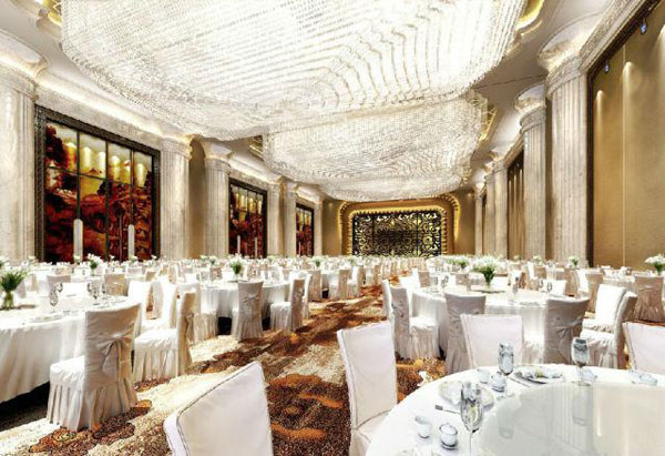 宴会厅大体量的水晶灯饰和入口的通高金箔画,旨在营造热烈的奢华感。让宴会人员倍感喜庆。主背景及柱式纹样融入伊斯兰纹样混搭,体现空间的异域奢华情调。