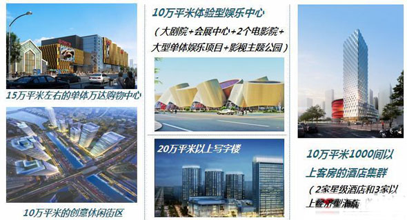 核心标准模块=15万方购物中心+20万方以上写字楼+10万方以上酒店+10万方休闲街区+10万方娱乐中心。