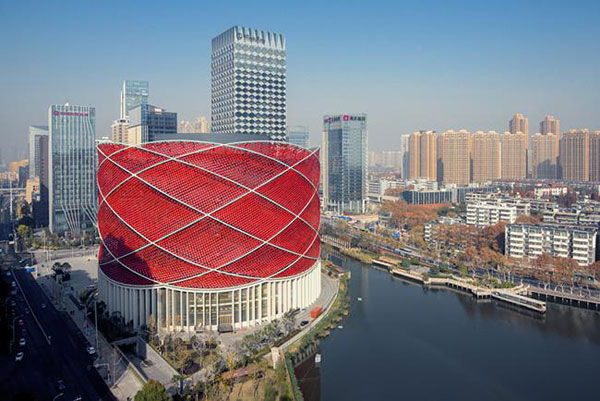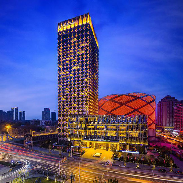 武汉汉街万达汉秀剧院位于武汉东湖区,是武汉中央文化区项目西部的重要组成部分,由伦敦Stufish Entertainment建筑事务所设计完成 ,这就是意大利弗兰克·德贡(Franco Dragone)为总导演的“汉秀” 剧院 。建筑造型设计源自中国传统的灯笼造型,外立面呈现与众不同的红色。纸灯笼传统的竹结构也在建筑上再现,八根相交的钢管环围绕着剧院舞台悬浮在轨道上。