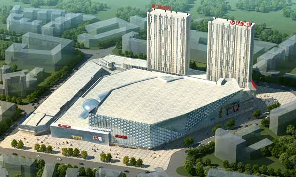 购物中心为高 层商业建筑,一至六层为商业营业厅,采用“一街带多楼”的商业规模模式,即以室内步行街将娱乐楼、百货楼、精品店、次主力店联通起来。娱乐楼5层,百货楼 6层,室内步行街3层,共享中庭3层通高,并以采光顶覆盖,步行街两侧设精品店。地上主要商业包括万千百货,室内商业步行街,电玩广场大歌星KTV,万达 影城,酒楼等。
