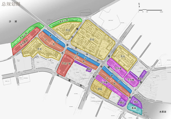 楚河、汉街是区域两条主轴线,商业、办公、观展、居住业态两翼布局;文化核心设施布局两端标定区域气质。
